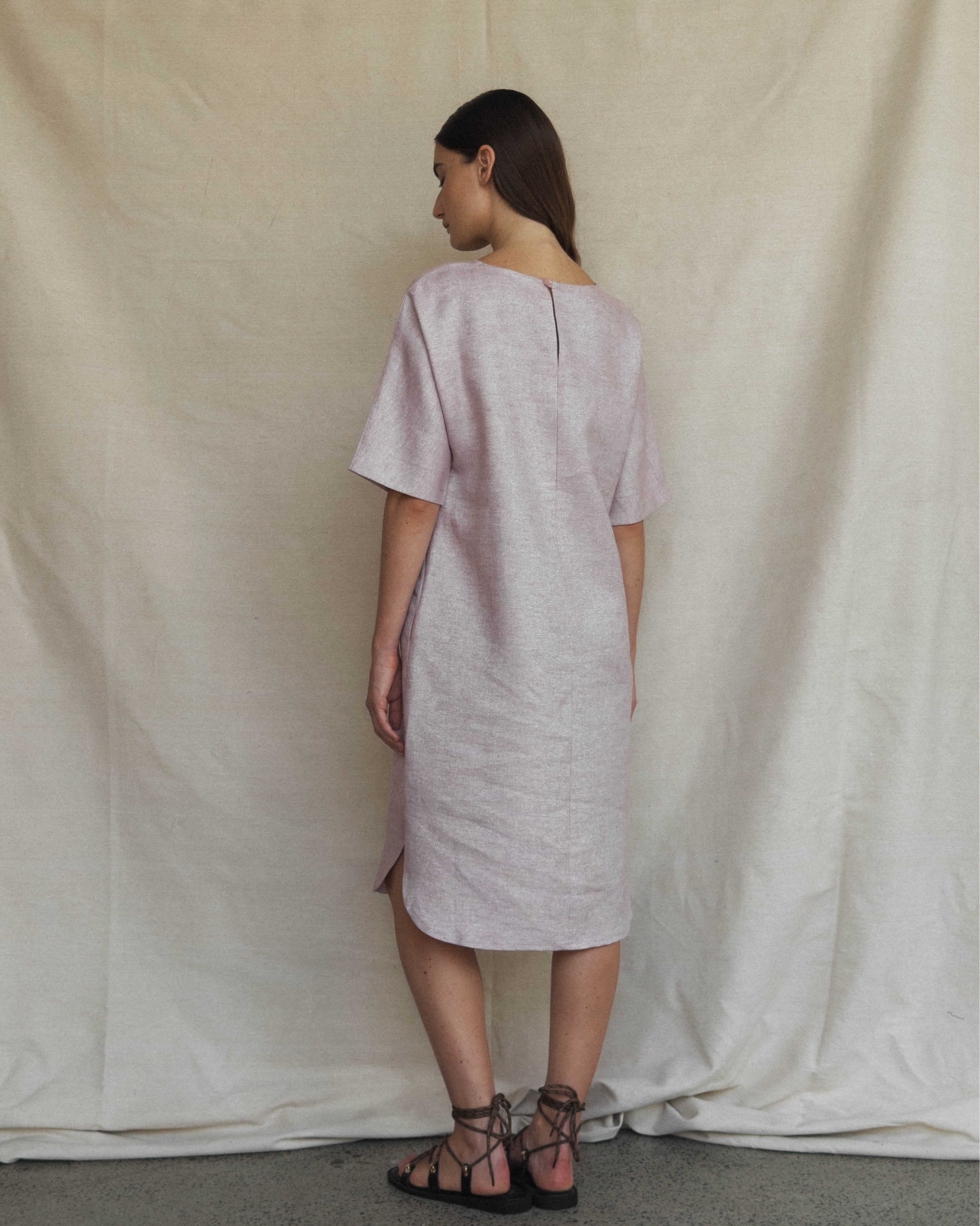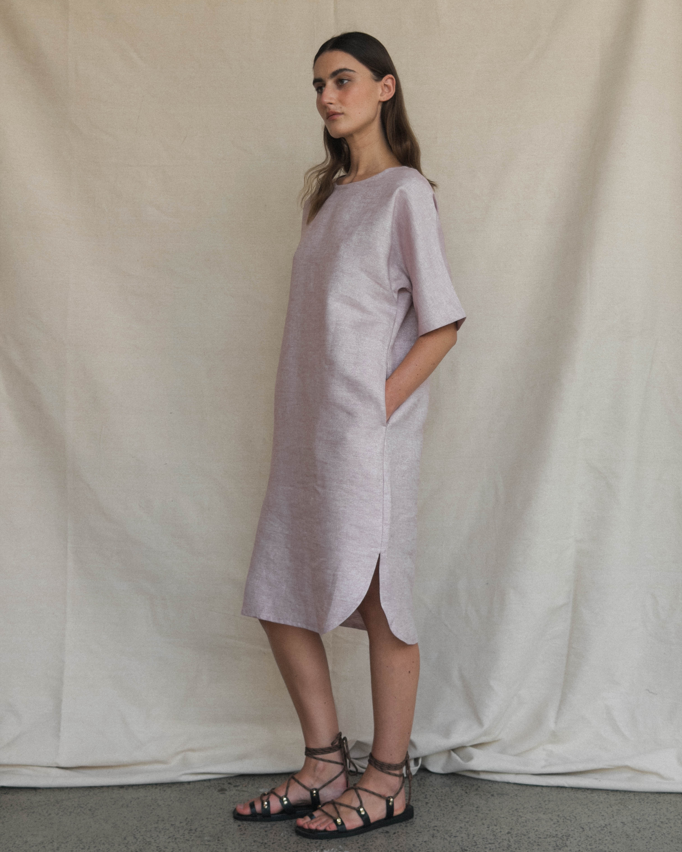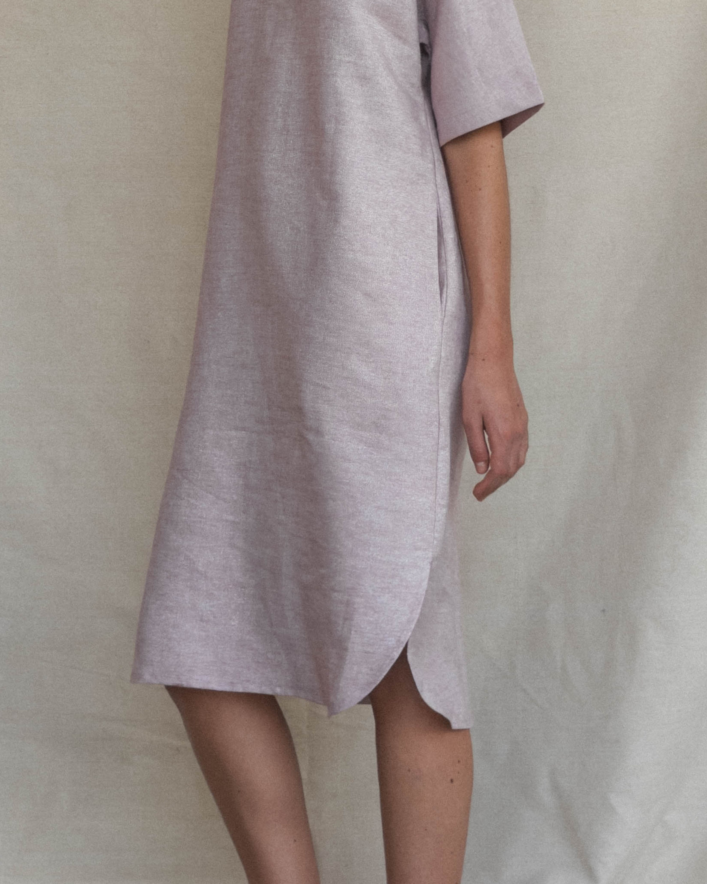 Design: This knee-length dress features signature dolman sleeves that create a fluid, continuous line from the shoulder, enhancing its relaxed drape. The design is characterised by a clean boat neckline, discreet side-seam pockets, and a curved hem with side splits for ease of movement. There’s a small button at the back to fasten the dress.
