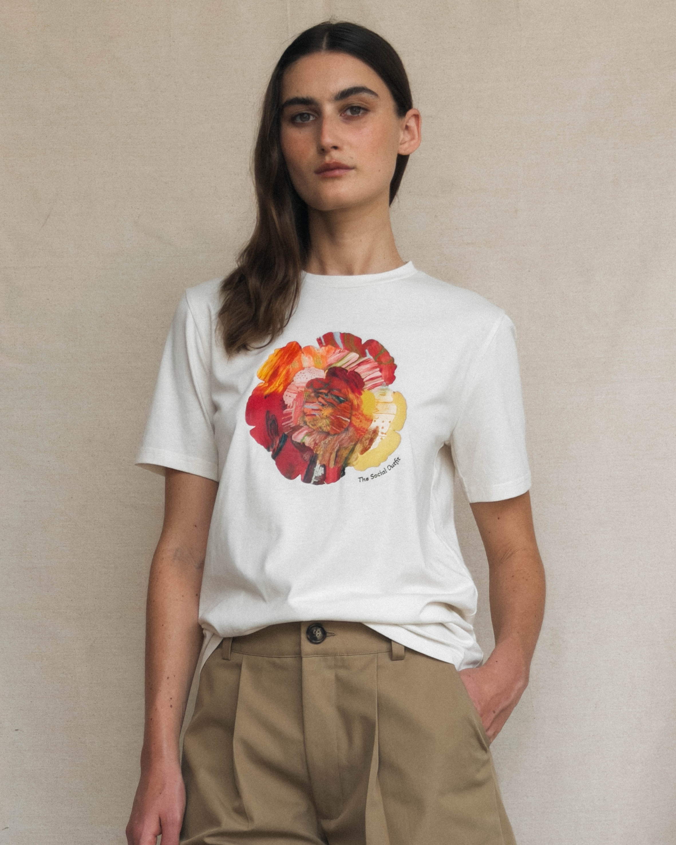 Overview: The Epson Printed Diya Flower Graphic Tee features a central, “Diya Flower” against a cream base. This classic tee serves as a wearable canvas. It offers a relaxed yet refined fit, making it an essential building block for a creative and curated casual wardrobe. Printed with original artwork by the women of Chester Hill Community Hub, each top carries a powerful statement.