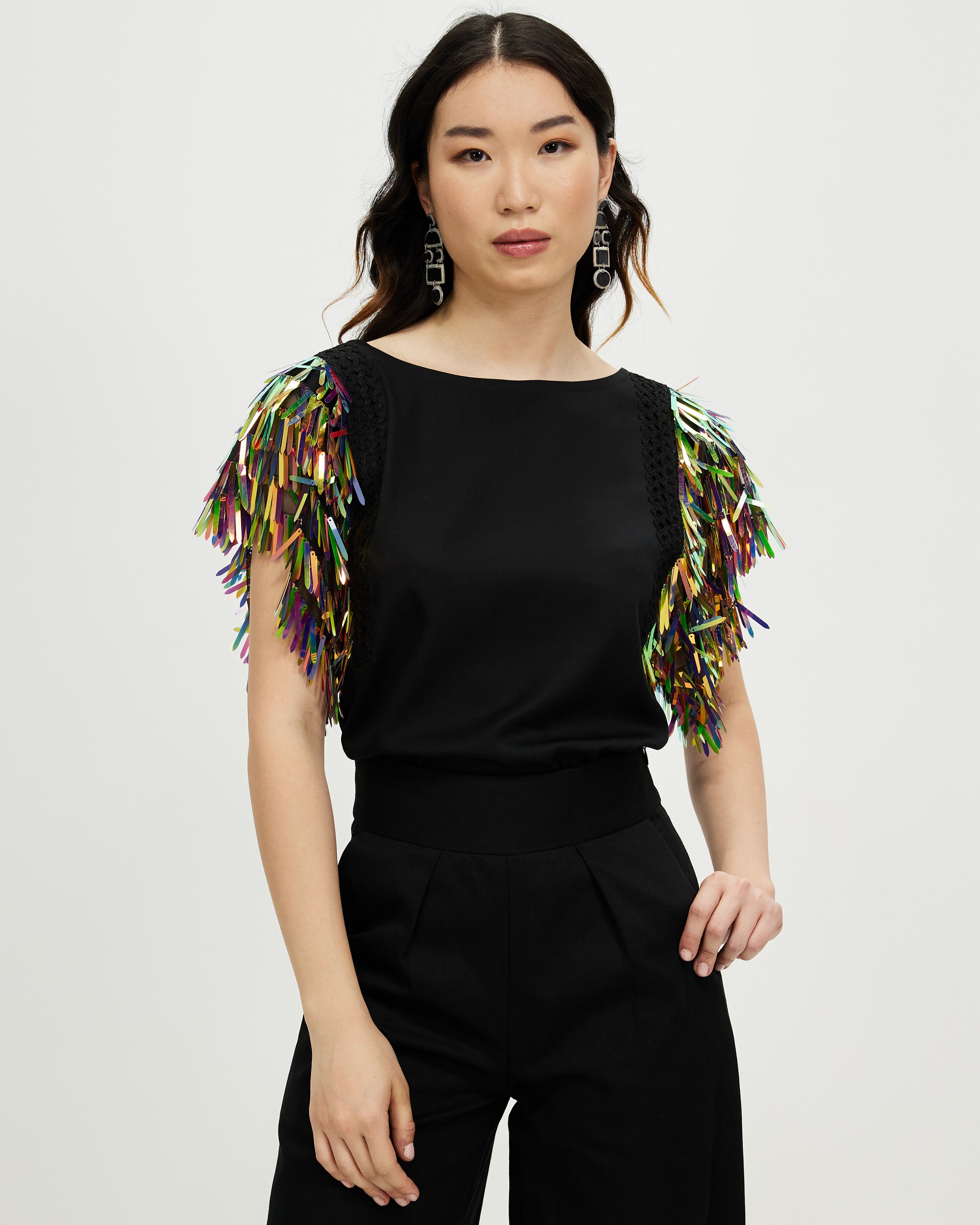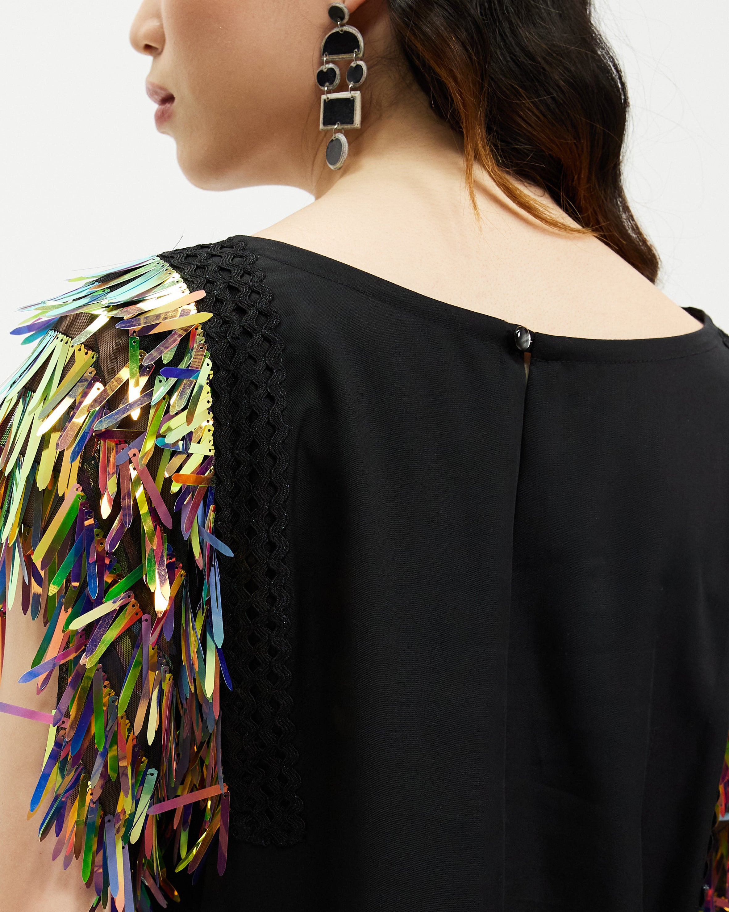Bold and a whole lotta fun! This top just makes you wanna shimmy those shoulders and hit the dance floor. A top that invokes the life and soul of the party. A long sequin embellishment paired with a crisp black luxe-feeling fabric makes this one a winner.