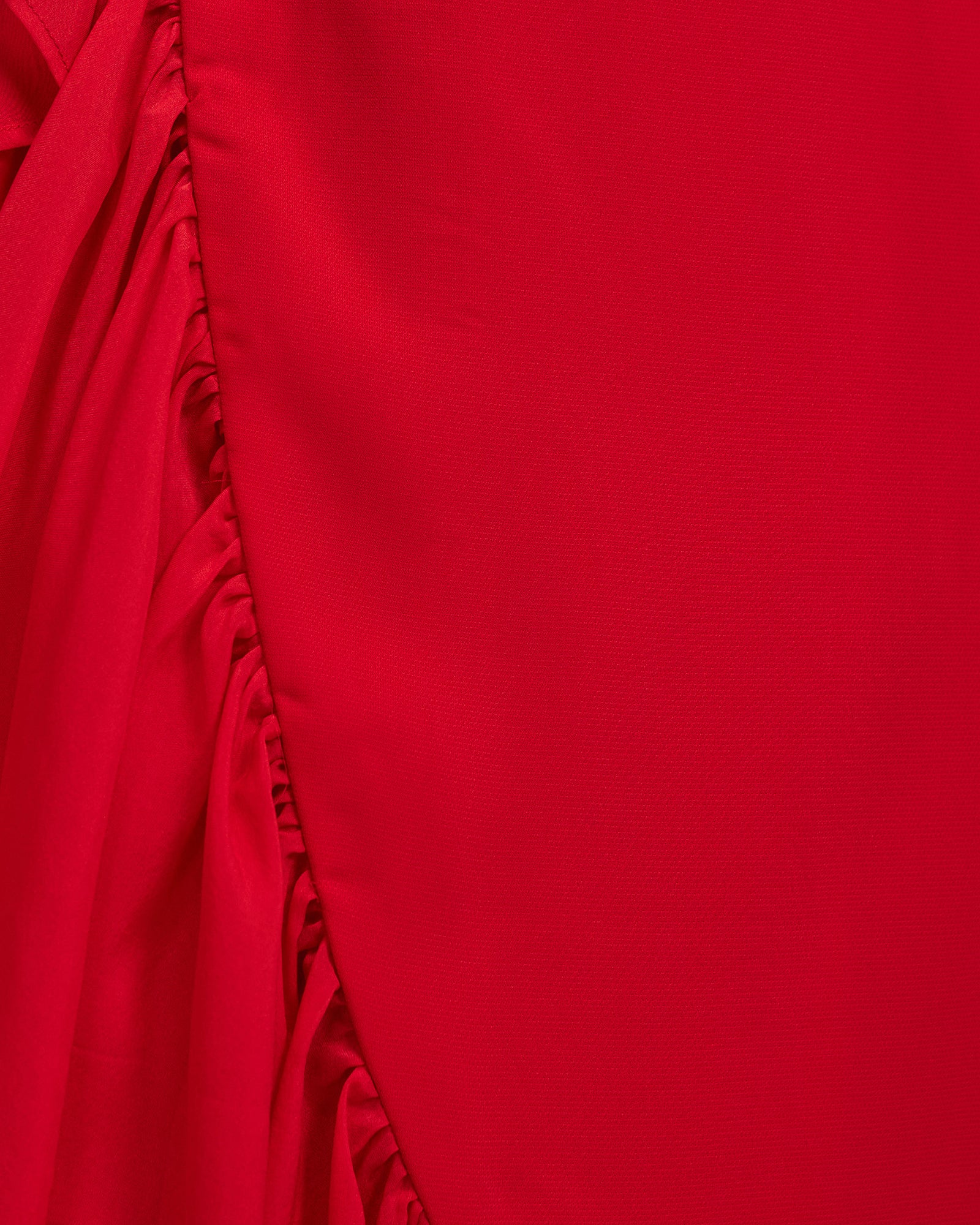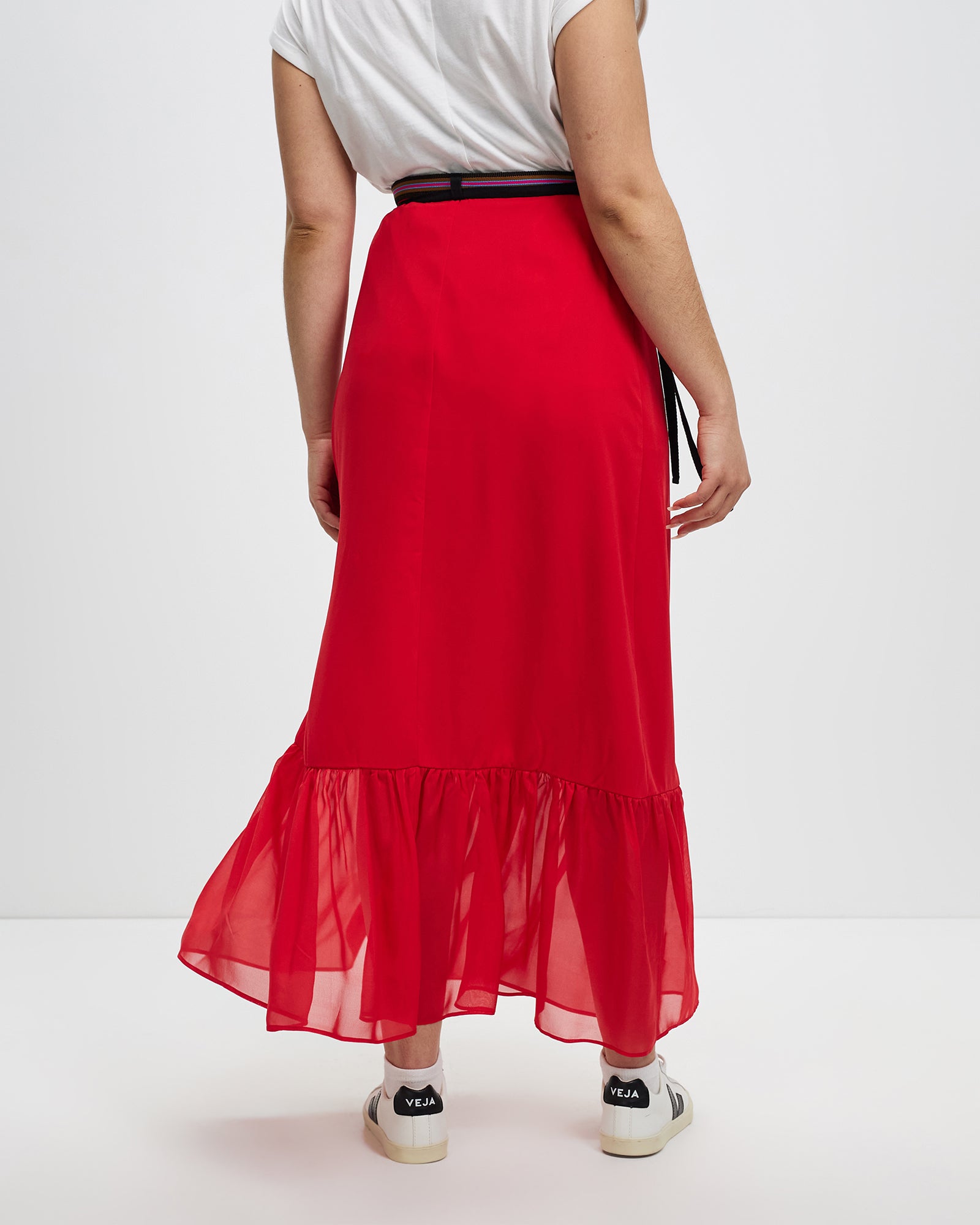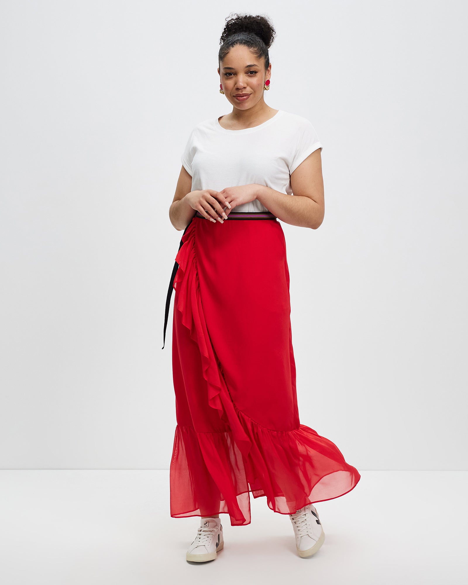 Insert the red dancing girl emoji… this skirt is the epitome of fun! We know that almost everything's better with a ruffle on it - that's why we've developed our Frill Wrap Skirt silhouette in a new luxe Guava Red fabric donated by Camilla and Marc... Style with basics and that's a wrap!