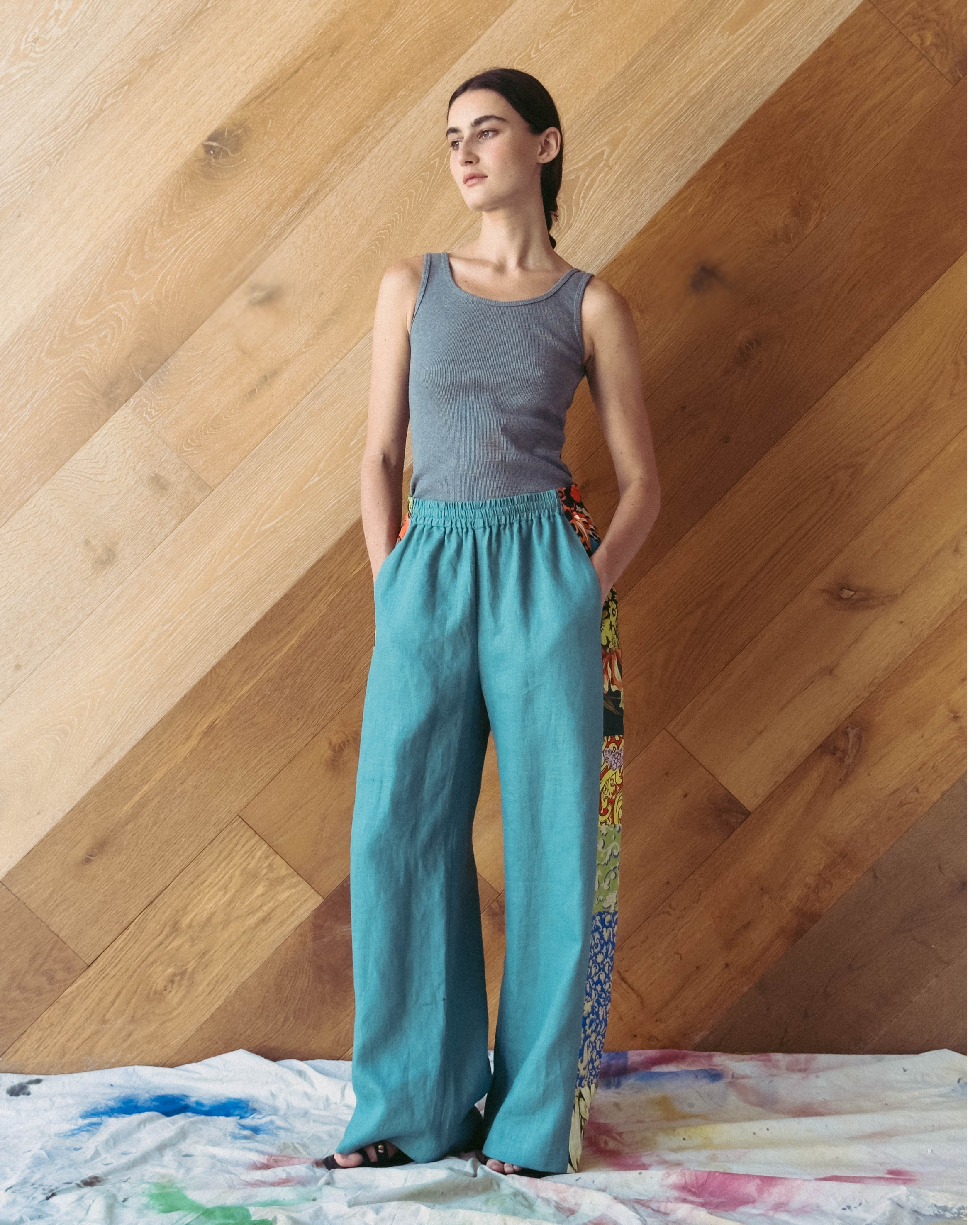 Design: Relaxed wide-leg silhouette with a softly draped fall. Elasticated waistband with a hidden drawstring waist and essential side pockets. Feature patchwork panels running down the sides create movement and visual interest while elongating the leg. Each pants’ patchwork prints are unique.
