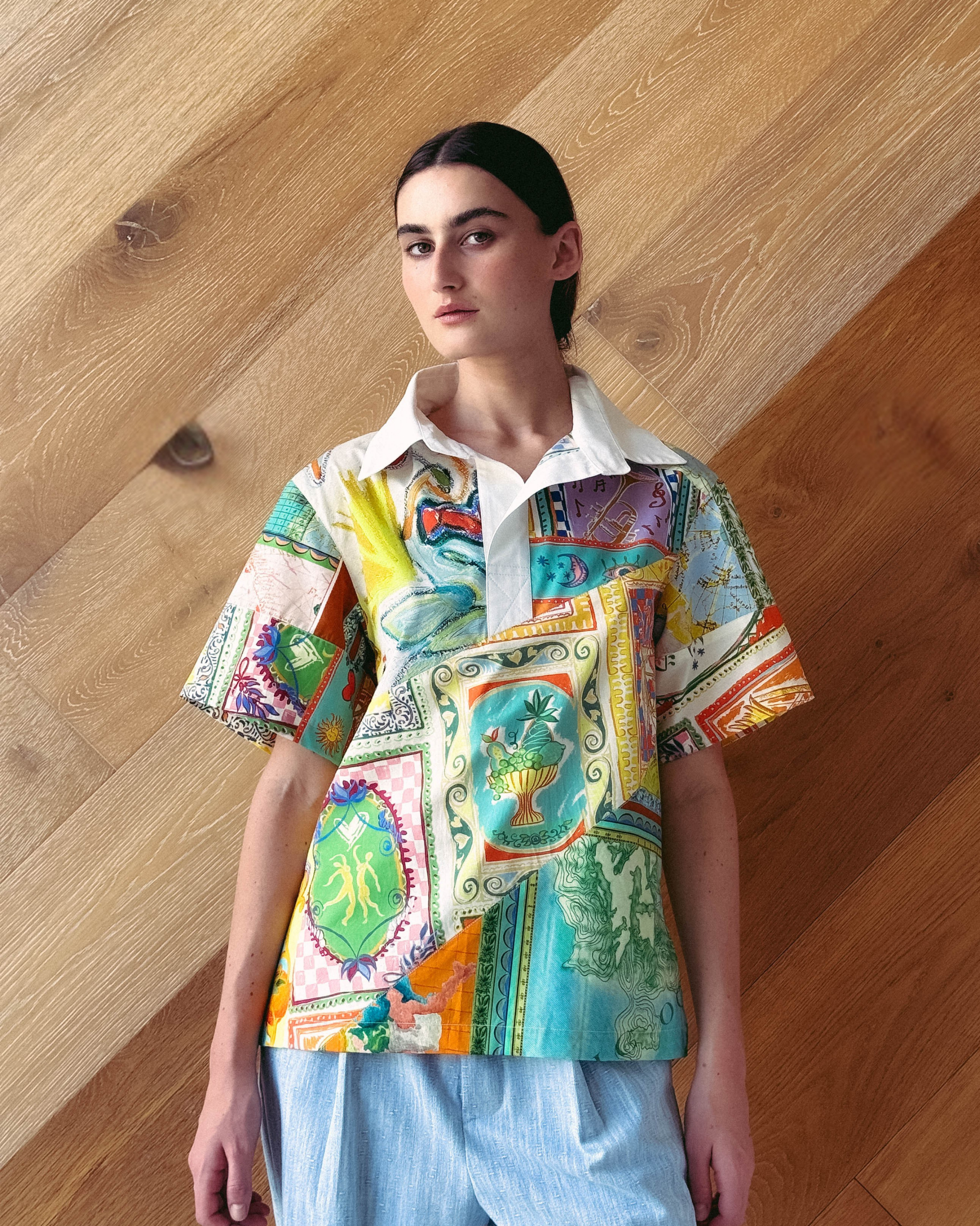 Overview: A contemporary reimagining of a classic silhouette, the Polo Top - Mixed Prints balances structured tailoring with an artful, relaxed energy. Cut with a boxy, oversized fit, this piece drapes effortlessly, offering playfulness and comfort. The open V-neck collar adds a touch of sharp refinement to the collage of textures and colours. Ethically made in our Marrickville studio, these polos were designed and made in small quantities in Sydney, Australia using fabric offcuts donated by partner brands including Alémais. Each polo is a one-of-a-kind limited edition piece.