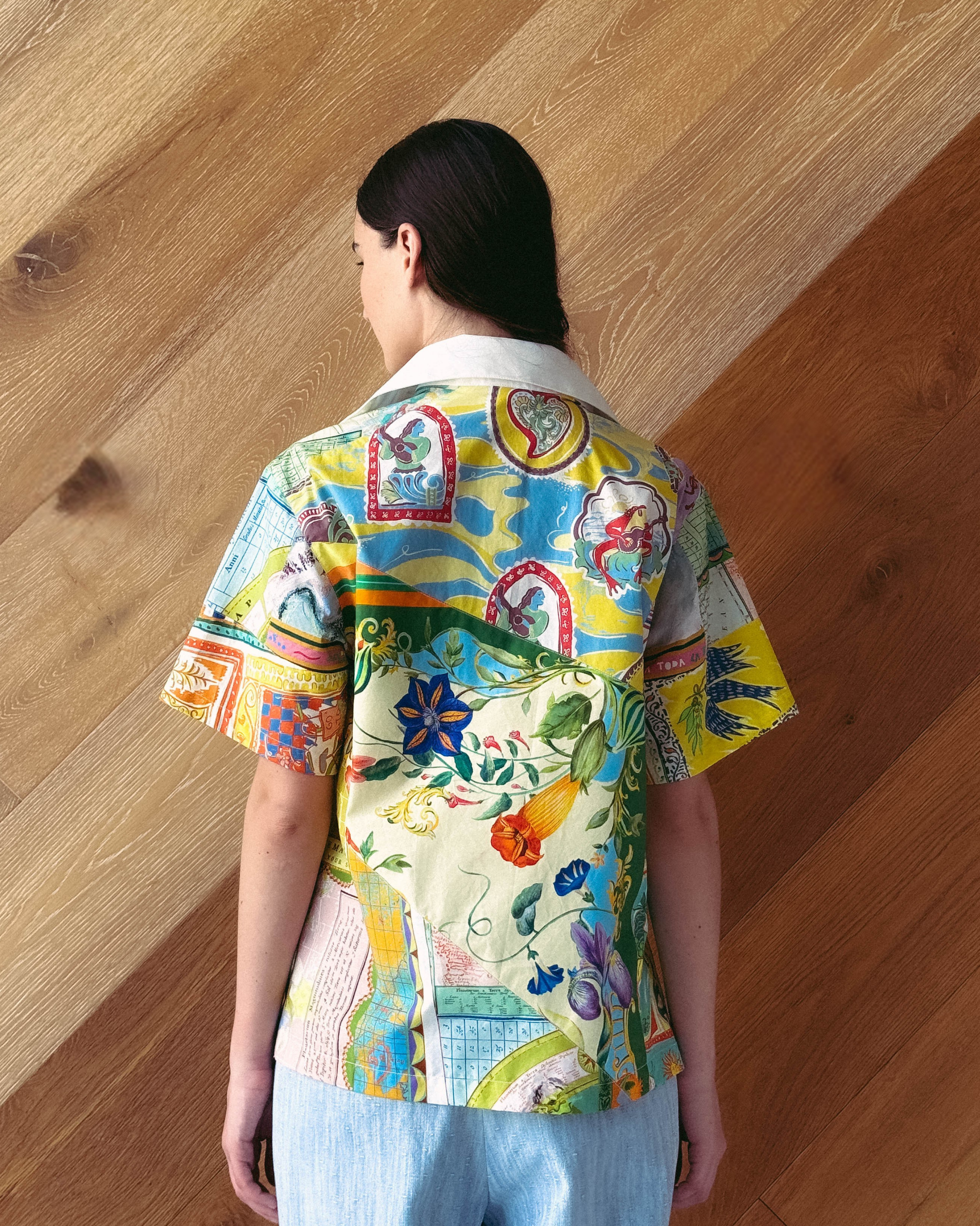 Design: Designed for a relaxed, boxy fit, the Polo Top offers a contemporary silhouette. The top features wide, elbow-length sleeves and a crisp, solid-coloured collar with an open V-neck placket. Expertly paneled from varying donated fabrics, the unique construction creates a playful visual rhythm, ensuring that the texture and character of every piece are as distinct as the prints themselves.