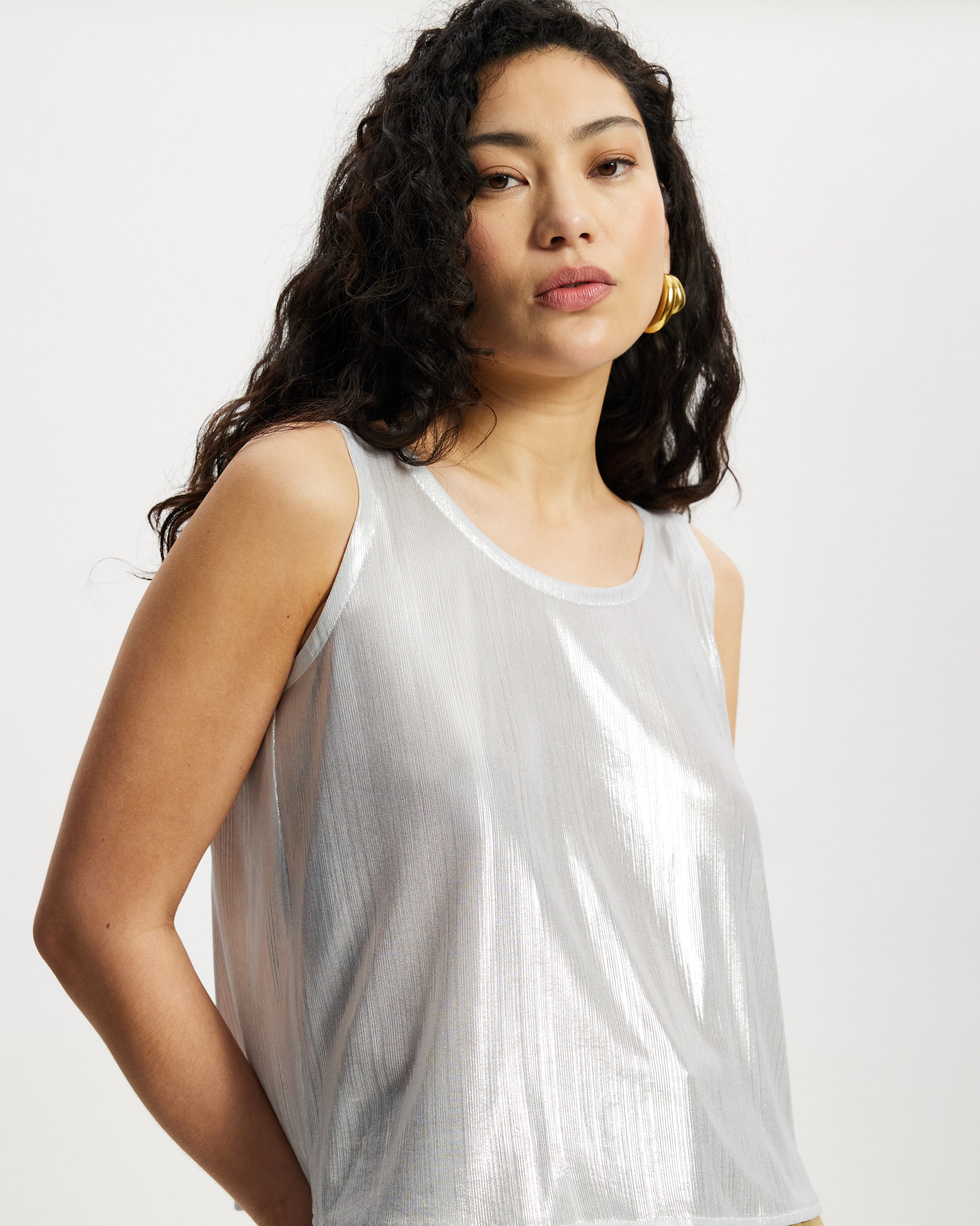 Model wears sleeveless Scoop shell top in sunbeam silver