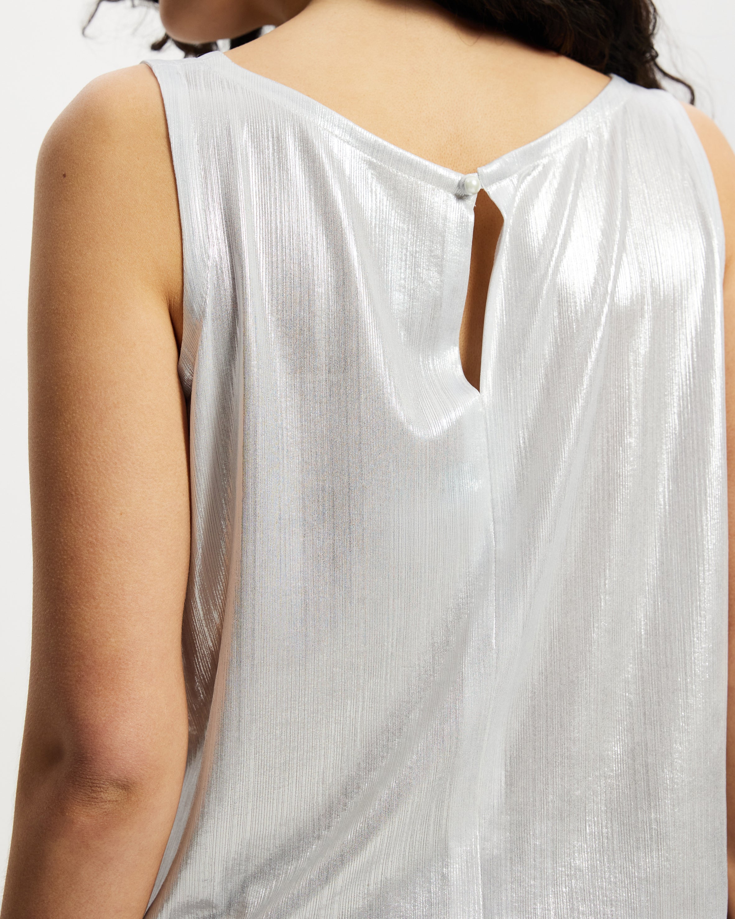 Light-catching and luminous. The Scoop Shell Top in Sunbeam Silver elevates a wardrobe essential with shine and a relaxed shape.
