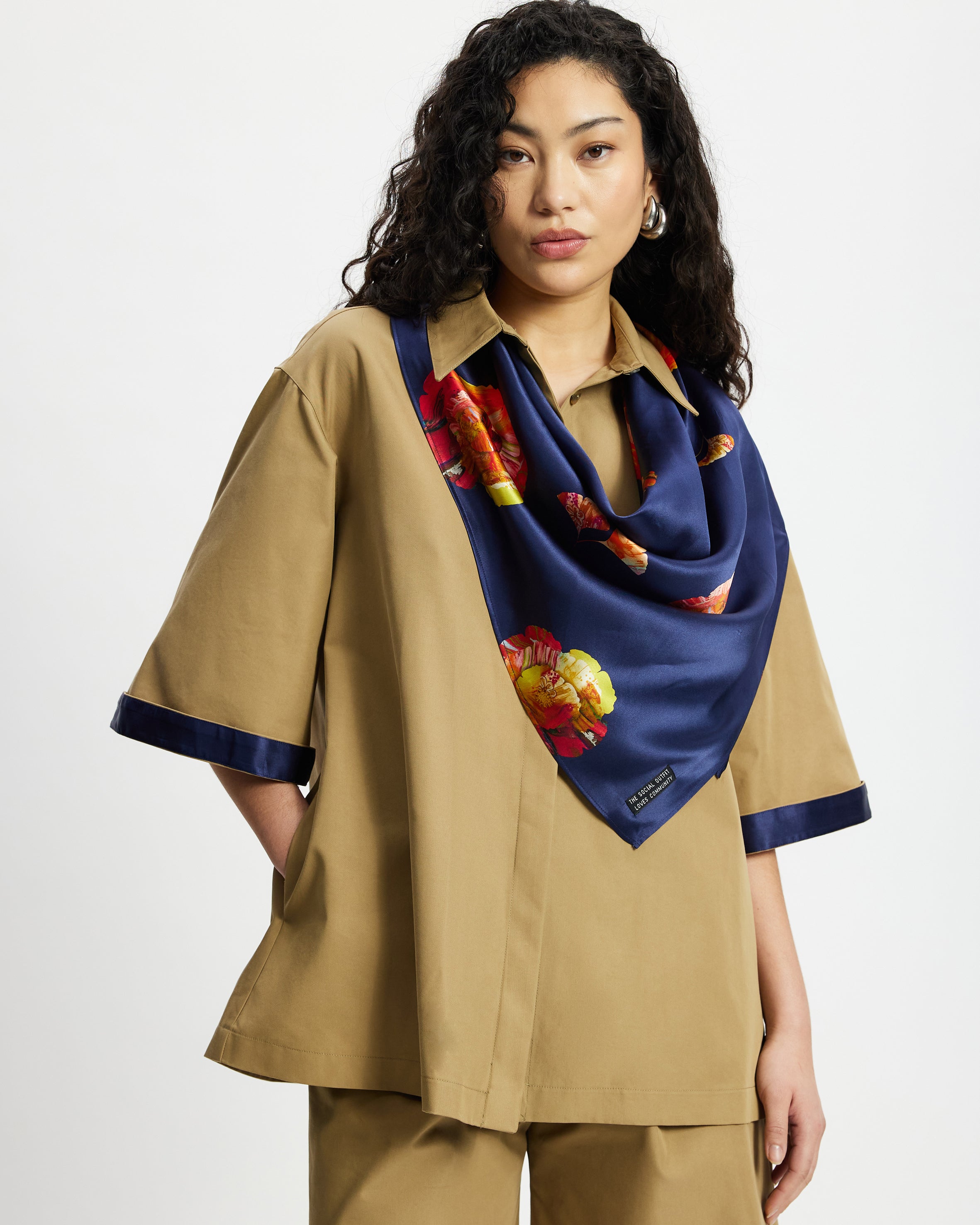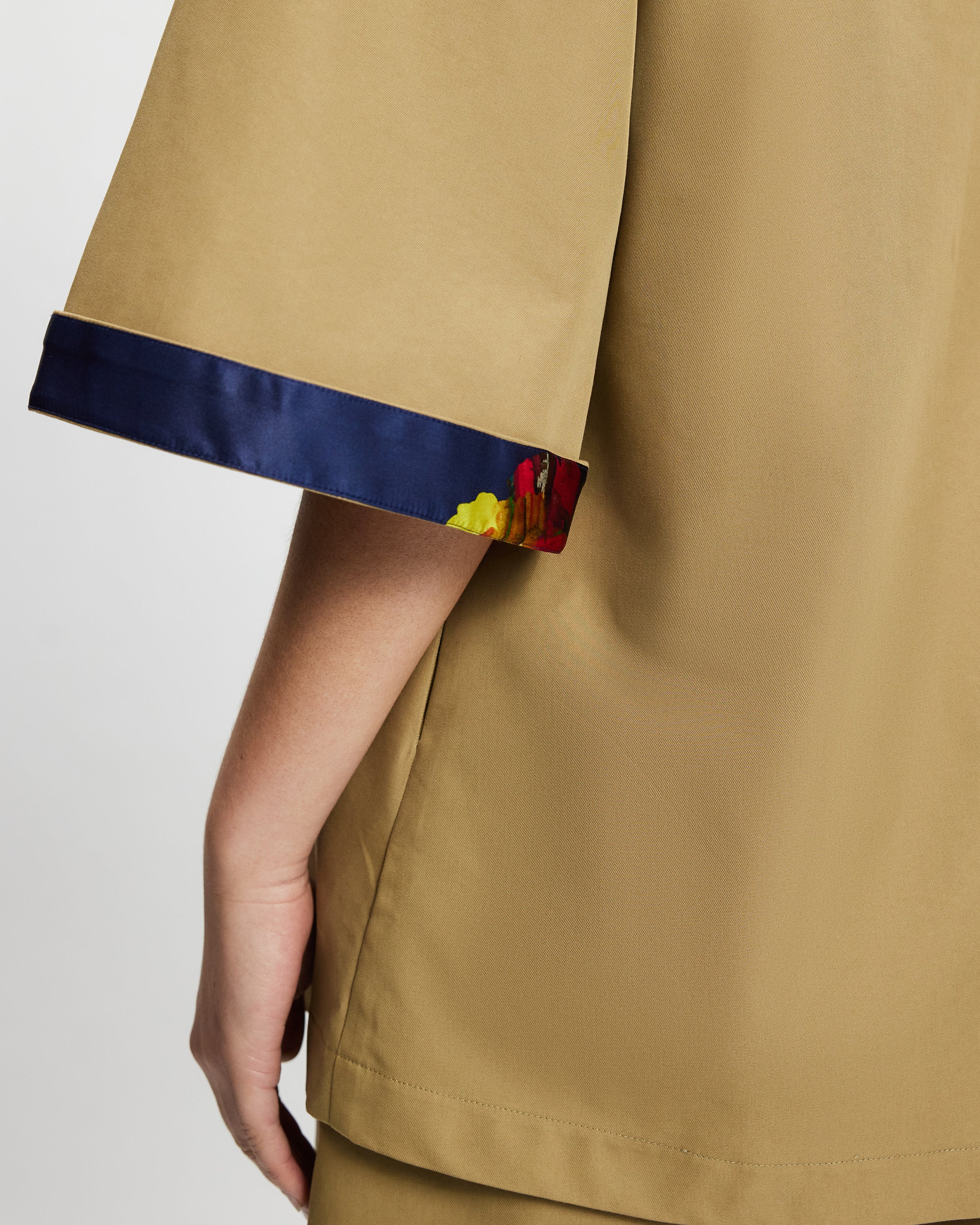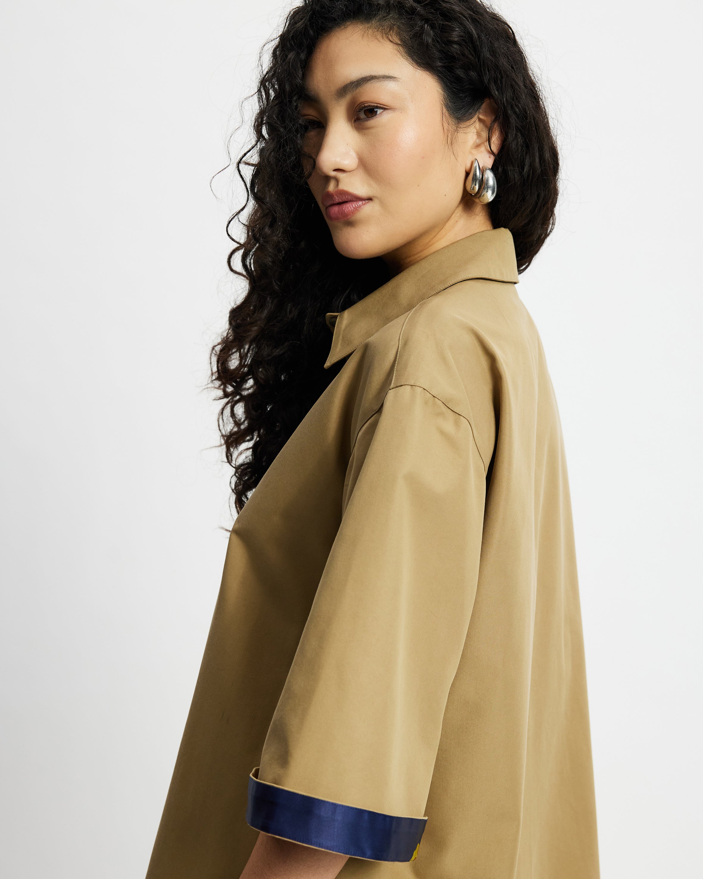 A modern layering piece. The Short Quarter Sleeve Trench in Tan redefines outerwear with clean lines and a cropped cut, blending polish with practicality.