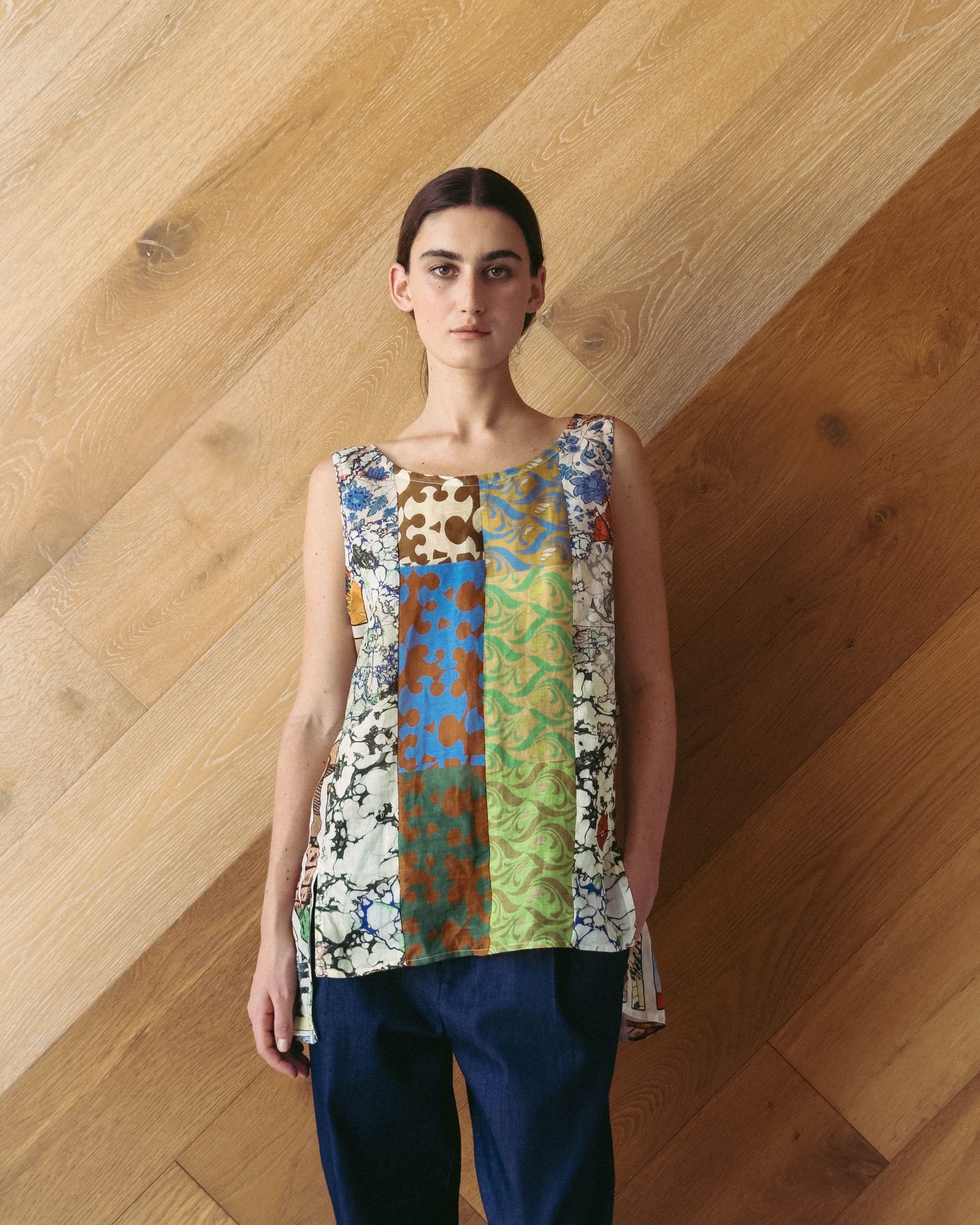 Overview: A summer essential with an artistic twist, the Singlet Top - Mixed Prints combines an effortless silhouette with the vibrant energy of our mixed-print collection. This reversible sleeveless top features a relaxed, breezy fit that drapes beautifully against the body, perfect for warm days or creative layering. The neckline adds a touch of modern sophistication to the playful collage of colours and textures. Ethically made in our Marrickville studio, this singlet was designed and made in small quantities in Sydney, Australia using fabric offcuts donated by partner brands including Alémais. Each singlet is a one-of-a-kind limited edition piece.